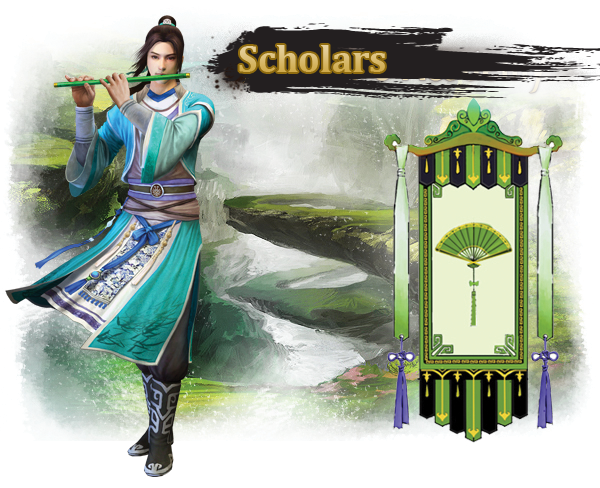 Perguruan Scholars didirikan oleh dua pelajar terkenal, Xiao Bieqing dan Shi Yanbing. Keduanya sama-sama menginginkan sebuah perguruan yang dapat menghasilkan para pelajar yang ahli di bidang seni dan bela diri. Semua anggota Scholars sangat mahir bermain kecapi, Weiqi, juga seni kaligrafi dan melukis. Mereka menyerang lawan dengan menggunakan frekuensi yang dihasilkan dari alunan musik.